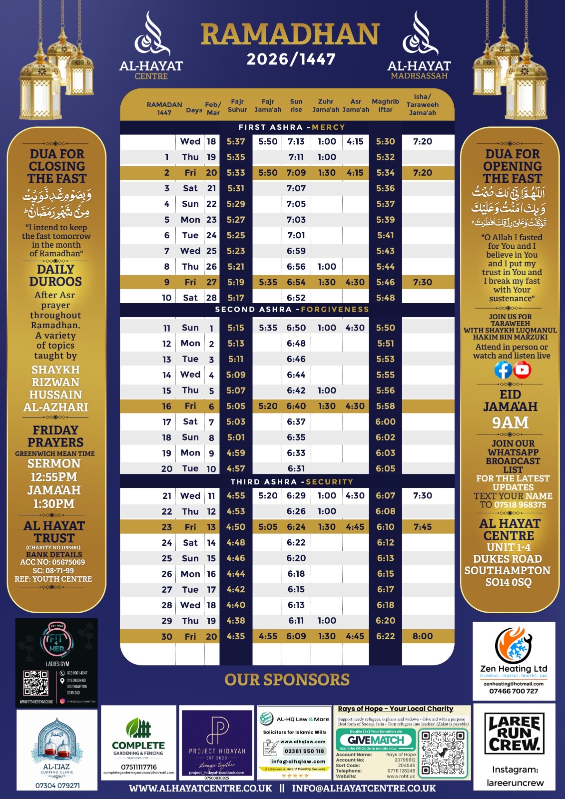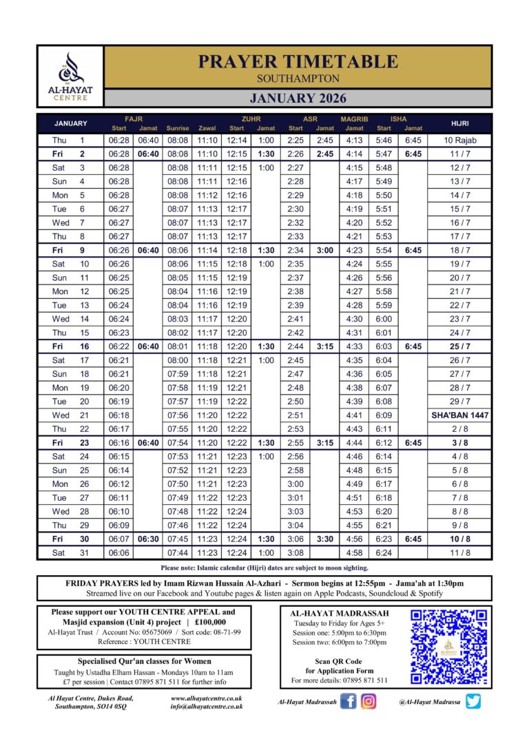 Al Hayat Centre Prayer Timetable